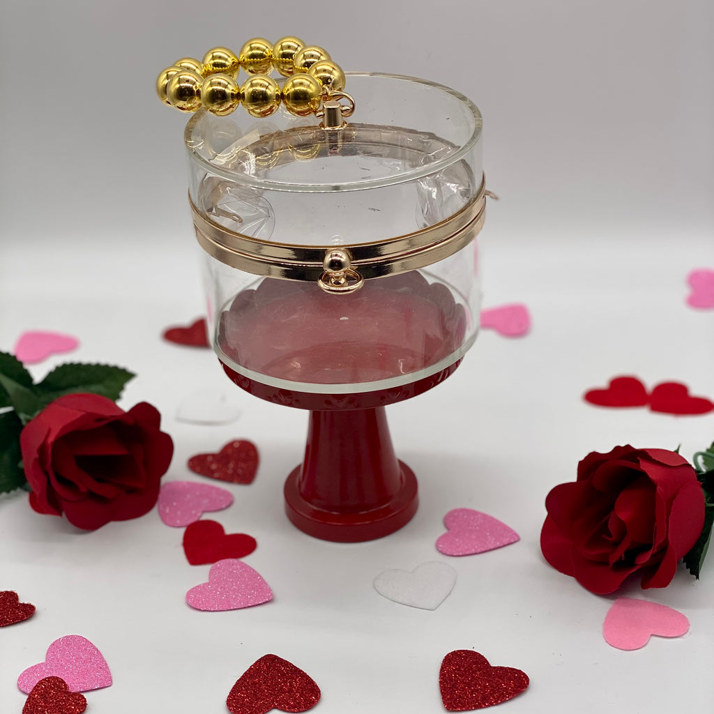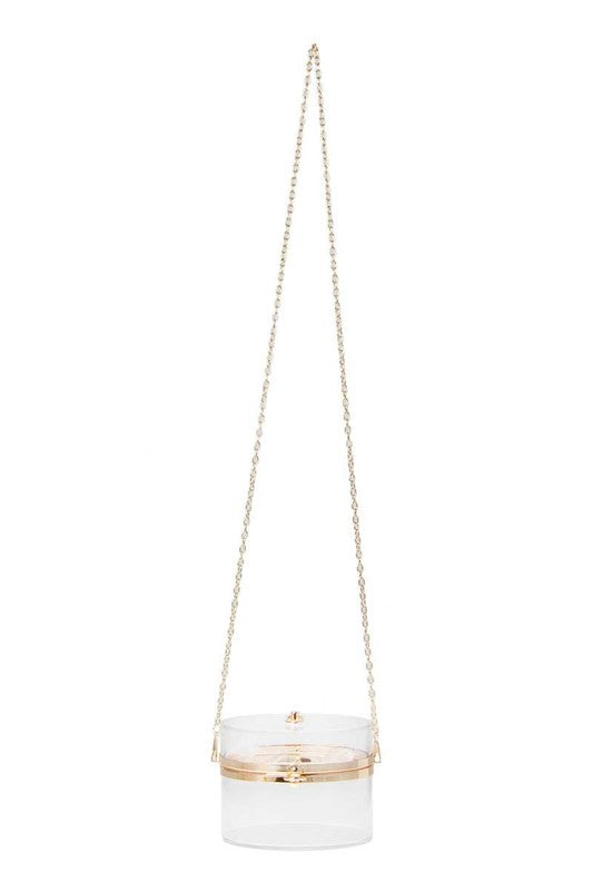 Clear Cylinder clutch accented with gold beaded top handle, aka THE date night bag of 2021. Also comes with gold chain and can be worn as a shoulder bag.