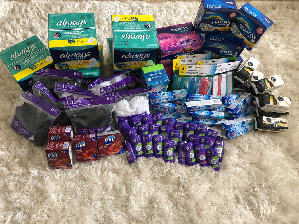 Bag will include but is not limited to: feminine care items, socks, toothbrush and toothpaste, nail polish, and deodorant.